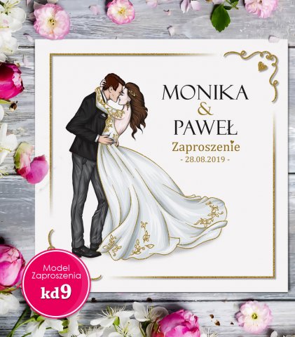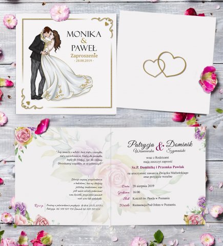 Zaproszenia ślubne w nowoczesnym stylu Glamour z motywem pary młodej, kwiatów i złota, które wykonane są z dużą starannością na materiałach najwyższej jakości.