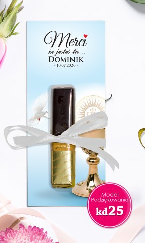 1 szt. podziękowań + do każdego podziękowania satynową wstążkę oraz dwustronne pianki samoprzylepne do  samodzielnego zamocowania czekoladki oraz zawiązania wstążkę.