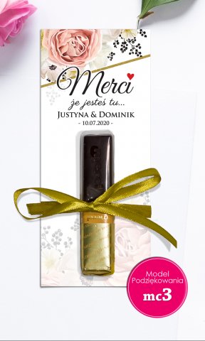 1 szt. podziękowań + do każdego podziękowania satynową wstążkę oraz dwustronne pianki samoprzylepne do samodzielnego zamocowania czekoladki oraz zawiązania wstążkę.