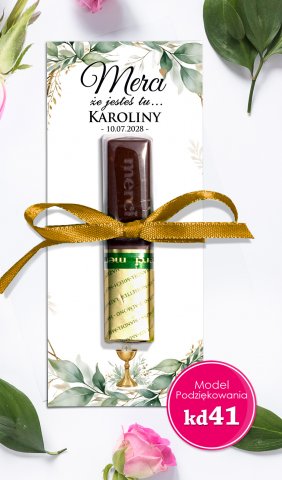 1 szt. podziękowań + do każdego podziękowania satynową wstążkę oraz dwustronne pianki samoprzylepne do  samodzielnego zamocowania czekoladki oraz zawiązania wstążkę.